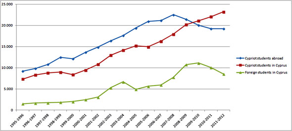 The number of students in Cyprus has increased rapidly over the last ten years. The following graph shows the number of Cypriot and foreign students in Cyprus and the number of Cypriot students studying abroad.