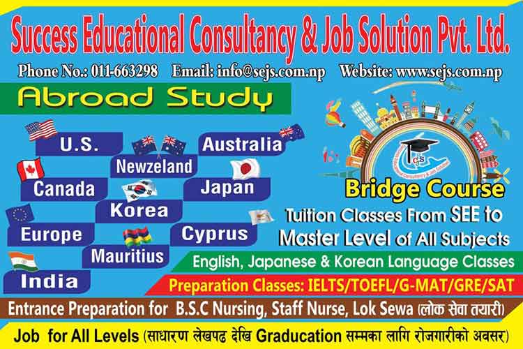 Success Educational Consultancy And Job Solution (SEJS) is a licensed educational and job Consultancy in Banepa -8 Kavre Nepal, is registered under the Govt. of Nepal having the Registration No 186727/074/075and VAT No 606744487 under the Companies Act 2006, Which specialized in overseas Education and Immigration services. We are located in Banepa -8 Kavre , Nepal just opposite to Nepal Electricity Office.